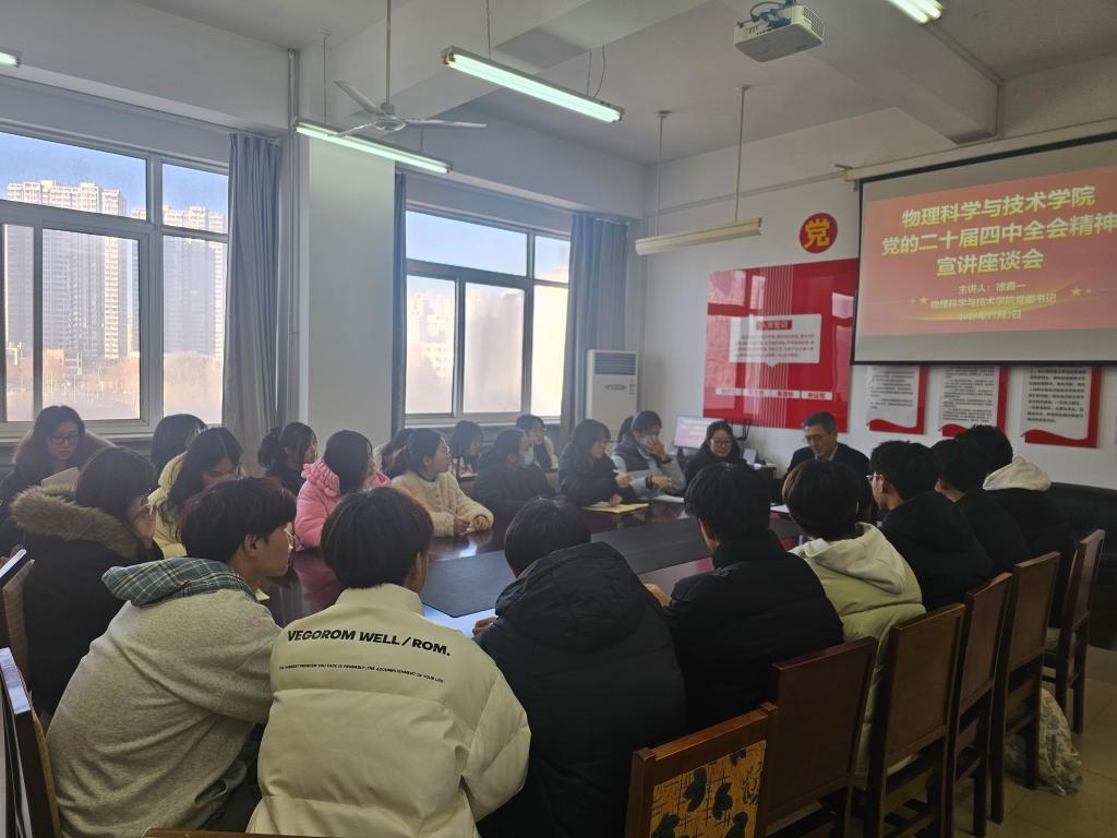 2025年12月2日,物理学院举办党的二十届四中全会精神宣讲座谈会。物理学院党委书记徐嘉一为包联的物理学专业2025级010203班的全体班团干部、宿舍长等学生代表宣讲党的二十届四中全会精神。宣讲会紧紧围绕深刻领会党的二十届四中全会的重大意义、全会基本情况、《建议》起草过程、准确把握“十五五”时期在基本实现社会主义现代化进程中的重要地位、深刻领会“十五五”时期经济社会发展的指导方针和主要目标、全面理解“十五五”时期经济社会发展的战略任务和重大举措、坚持和加强党的全面领导,凝聚起推进中国式现代化的磅礴力量等重要内容进行了宣讲。